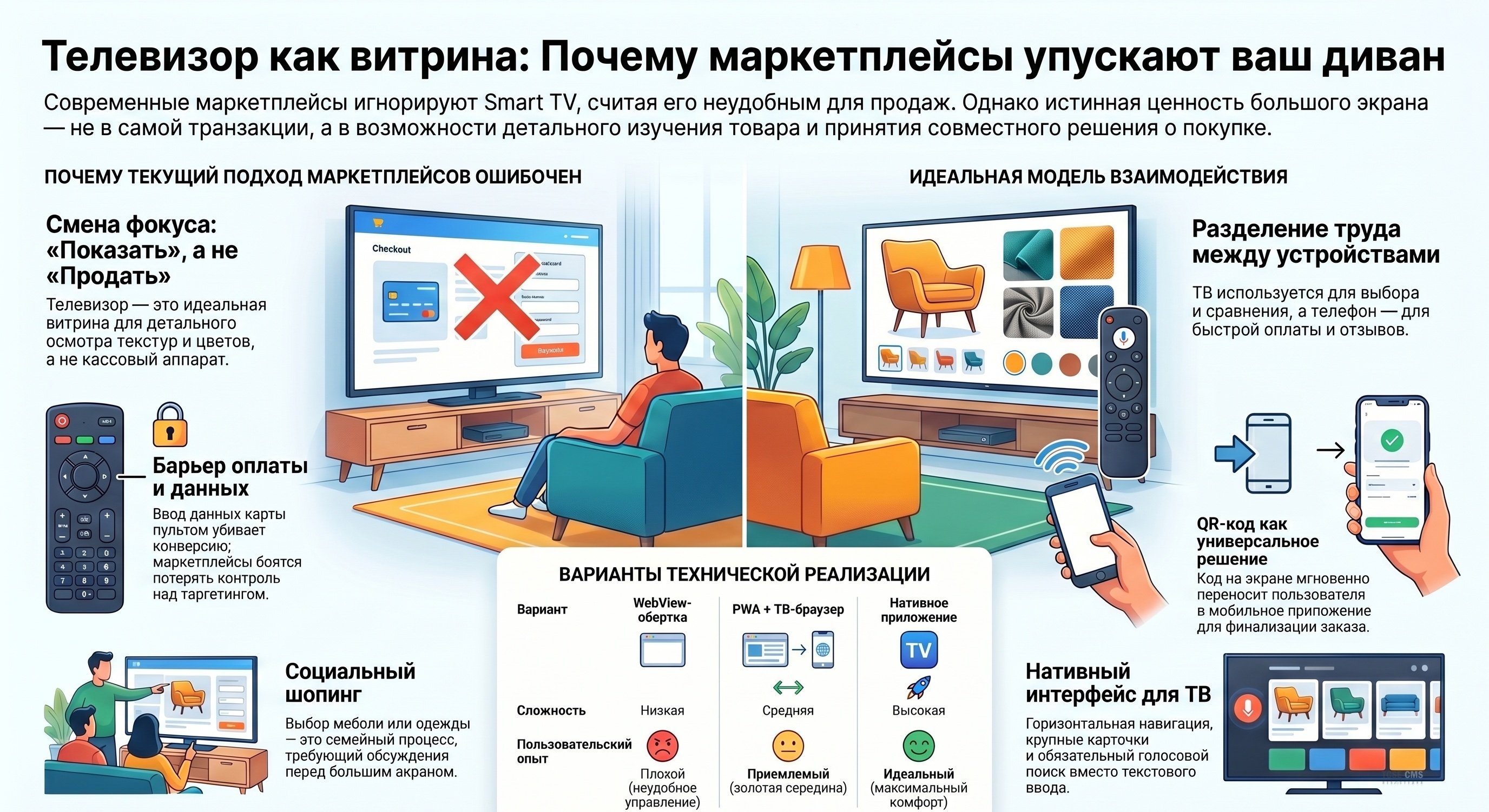 Представьте: сидите вы на диване. Перед вами — огромный экран. За спиной — холодильник с пивом. Рядом — супруга, которая всё равно листает свой телефон. И тут вас осеняет: «А почему я, чёрт возьми, не могу листать каталог с кухонной техникой на этом здоровенном телике? Зачем мне жаться в экранчик айфона, когда передо мной 65 дюймов чистого, незанятого простора?»
