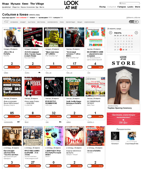 За месяц, что я там мельком появляюсь, все еще не успел рассмотреть все уголки и перечитать статьи – их слишком много:) Больше всего меня привлек раздел события – здесь вы можете посмотреть перечень мероприятий, которые планируются в ближайшее время для вашего города. Причем здесь вы на найдете в афише концерт Аллы Борисовны и тому подобных (как мне показалось), на LookAtMe все модное, андеграундное и продвинутое что-ли:) Точнее будет сказать вы теоретически можете найти здесь концерт Пугачевой, но 80% мероприятий отсюда не отыщете ни в одной афише других сайтов – лаунж вечеринки на крыше многоэтажки, выставки фотографов, художников, показы, презентации, лекции, соревнования.