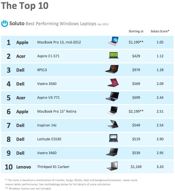 — израильская сервисная компания, предоставляющая возможность управления компьютерами удаленно на базе облачного сервиса, следила за работой 150 тысяч ноутбуков на протяжении трех месяцев. В ходе исследования учитывались такие показатели, как скорость загрузки при включении, количество фоновых процессов, «зависаний» системы и отказов приложений. Окончательный вердикт оказался довольно неожиданным — MacBook Pro был назван «наиболее эффективным» ноутбуком для работы с Windows.